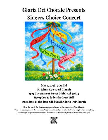 The date is approaching fast and we’re making preparations. Don’t miss out on our Spring Concert featuring selections chosen by the choir! Friday, May 1, 2026. St. John's Episcopal Church 7 PM.